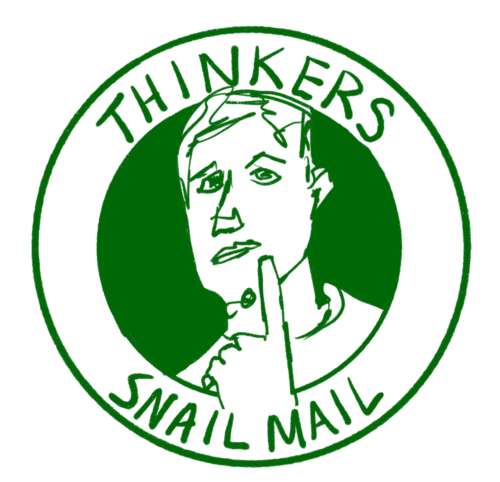 One original print. A quick one liner about my thoughts. The Thinker’s Pose stamped on the envelope. Every month. Straight to your mailbox.